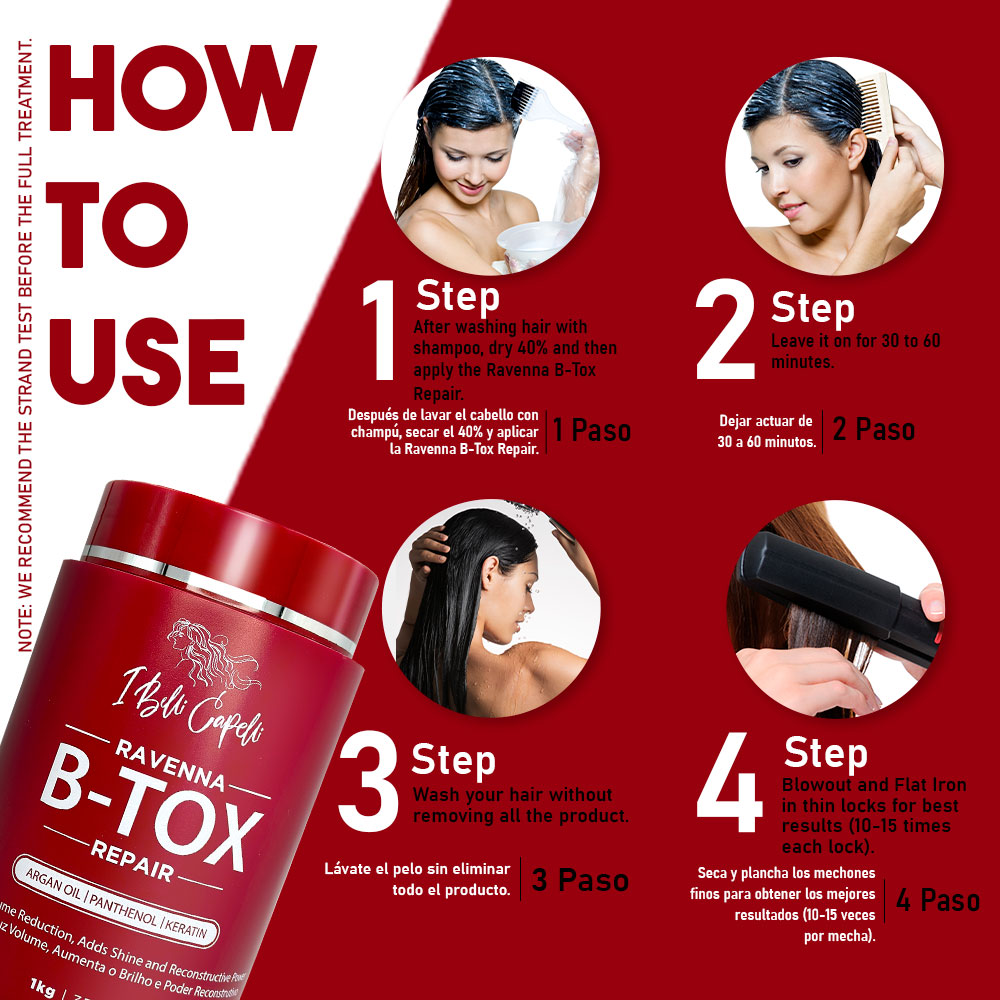 After washing the hair with a clarifying shampoo, partially dry and apply the B-tox Repair, leaving it on for 15 to 60 minutes, depending on the desired effect. Blow-dry completely and finish with a flat iron. Then, at the next hair wash, apply the Ravenna Hair Mask to clean, damp hair, distributing it along the lengths and ends. Leave it on for 3 to 5 minutes and rinse thoroughly.
